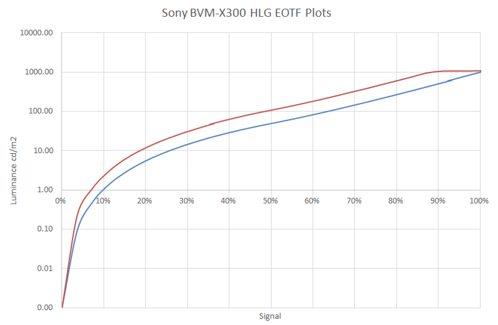 You might have previously heard Sony's "best practise" (sic) advice of setting 50% grey to 100Cd/m2 but this is wrong. Look at the graph; this is the result of profiling an X300 (and they all seem to do it consistently) and notice what happens over the last couple of hundred Candelas at the top end. If you set 50% grey to 100Cd/m2 you get loss of detail in the specular highlights. For the correctly 1.2 HLG curve you need to set 50% to around 50Cd/m2 to 55Cd/m2- remember the Y-axis on this graph is logarithmic.